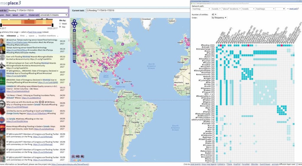 SensePlace2 / SensePlace3 was a project I collaborated on as a researcher at The Pennsylvania State University. Collaborators were in the Geography Department, the College of Information Sciences and Technology, and the Computer Science and Engineering Department. This project was funded by the US Department of Homeland Security (DHS) and the US Army Corps of Engineers Research and Development Center (ERDC), Geospatial Research Laboratory. We aimed to analyze place-time-attribute information in Twitter tweets and make sense of places from millions of tweets. Not only did we build a social media analytics system to map and analyze the small percentage of tweets where the user enabled their location, but we also led the way in analyzing the places mentioned in the tweets. Our work was one of the first to describe using tweets and their location data for emergency situational awareness. It also led to meaningful discussions in the research and emergency response communities of the ethics of location-based data in crises.