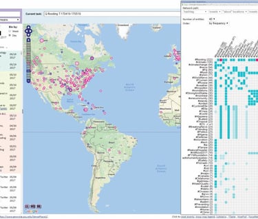To make sense of place-time attribute information in big social media data, I helped create a geovisual analytics system that allows a human-in-the-loop sense-making process. This project also spun off GeoTxt, a web API for geoparsing and geocoding place names in text documents, to which I contributed heavily.